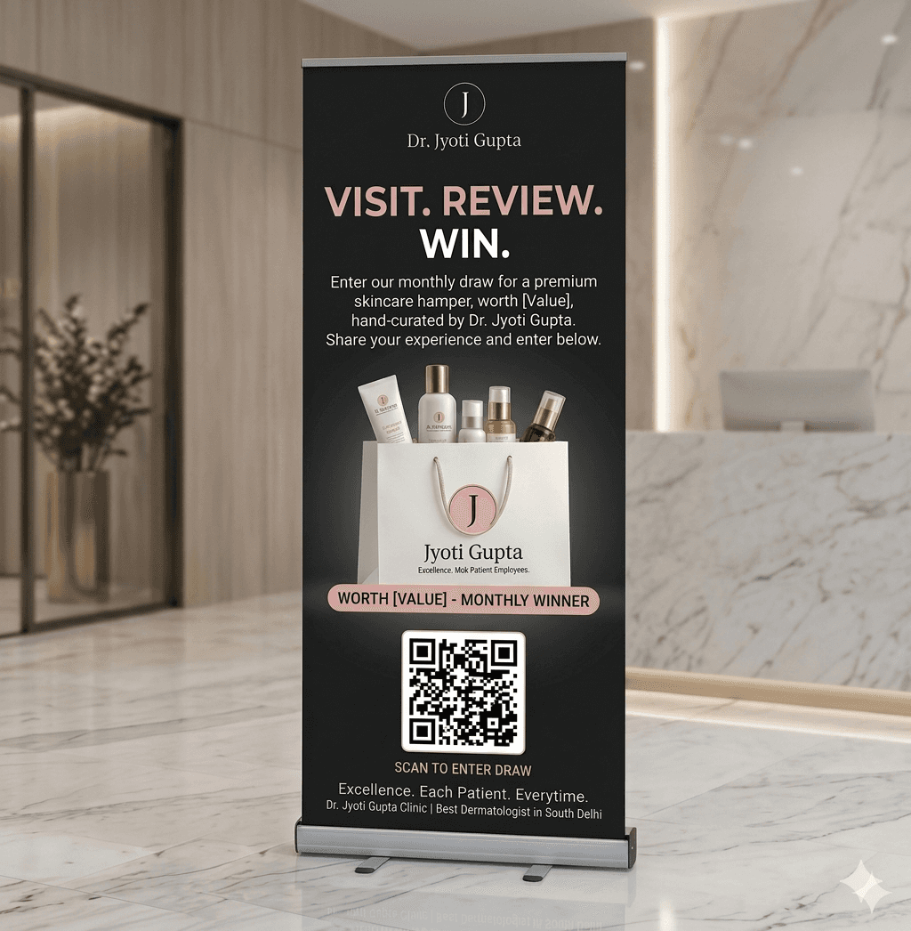 • Launched the Glow Review Program — a Scan to Win campaign placed at the clinic reception and exit, inviting every patient to leave a Google review for a chance to win a curated Dr. Jyoti Gupta skincare hamper